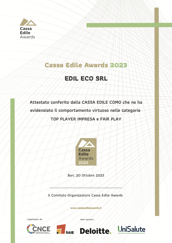 EDIL-ECO Srl ha conquistato il prestigioso Cassa Edile Award per tre anni consecutivi (2025, 2024 e 2023) nelle sedi di Milano e Como. Questo triplo riconoscimento è stato assegnato per l’eccellenza dimostrata in tutte le categorie previste dal premio: TOP PLAYER IMPRESA, FAIR PLAY e SPRINT.