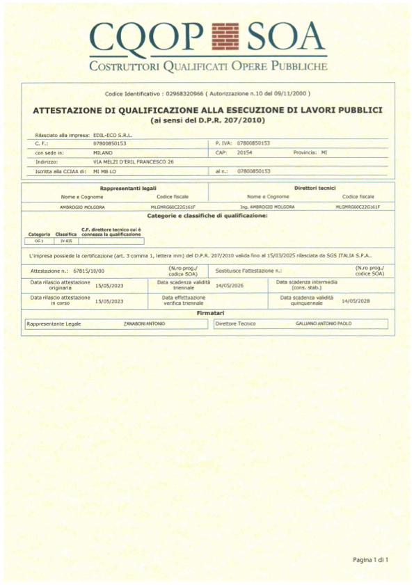 EDIL-ECO srl è certificata CQOP SOA (Società Organismo Attestazione Costruttori Qualificati Opere Pubbliche) certificazione obbligatoria per prendere parte a gare d’appalto destinate alla realizzazione di lavori in ambito pubblico.