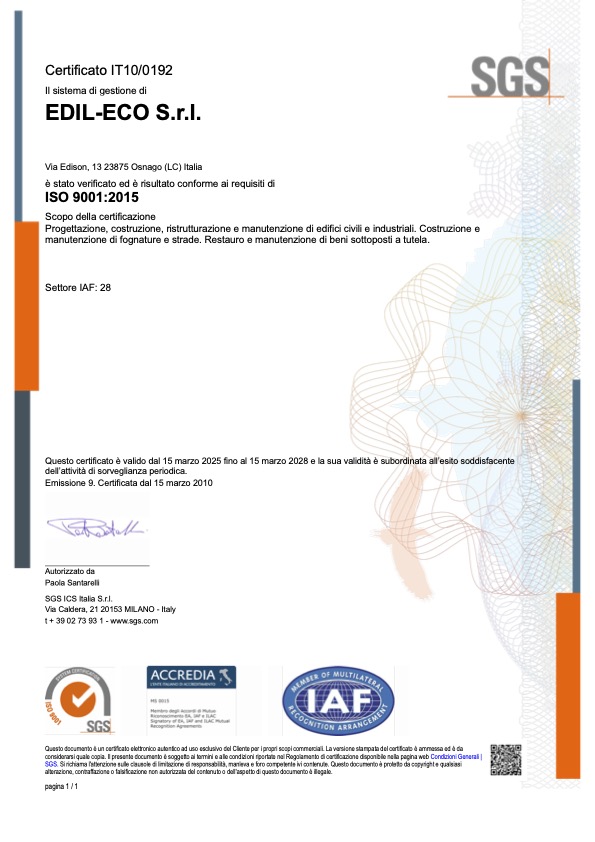 EDIL-ECO srl ha ricevuto la certificazione SGS (Société Générale de Surveillance), società che si occupa di monitorare, verificare e certificare servizi e sistemi per garantire la qualità di un’azienda.