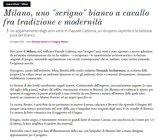 “Nel cuore di Milano, nel trafficato Piazzale Cadorna, uno “scrigno” anni venti è stato riportato a nuovo splendore da un’attenta ristrutturazione che ne ha esaltato – e recuperato – le caratteristiche architettoniche e le finiture originali di pregio, mixandole sapientemente con tocchi contemporanei che ne esaltano, come cartine tornasole, l’originaria unicità.” casa.grazia.it
